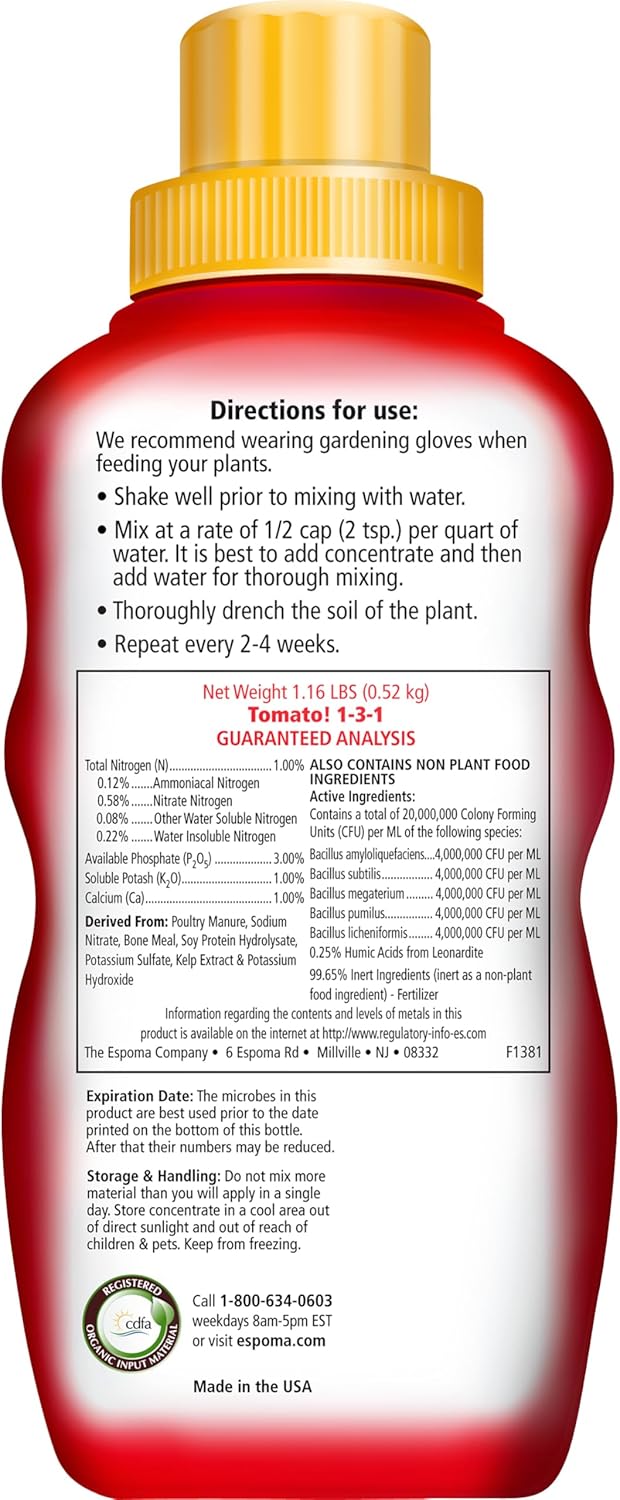 Espoma Tomato! 16 oz liquid fertilizer is crafted specifically for tomatoes and other heavy-feeding crops. This organic plant food delivers essential nutrients and beneficial microbes for plump, flavorful, and abundant tomatoes all season long.